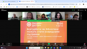 25 березня 2025 року завідувачка бібліотеки нашого ліцею взяла участь в онлайн-засіданні міжнародного круглого столу «Бібліотека для подолання суспільних викликів у громадах». Захід зібрав фахівців бібліотечної та культурної сфер з України та інших європейських країн для обміну досвідом та обговорення актуальної ролі бібліотек у сучасному суспільстві.
