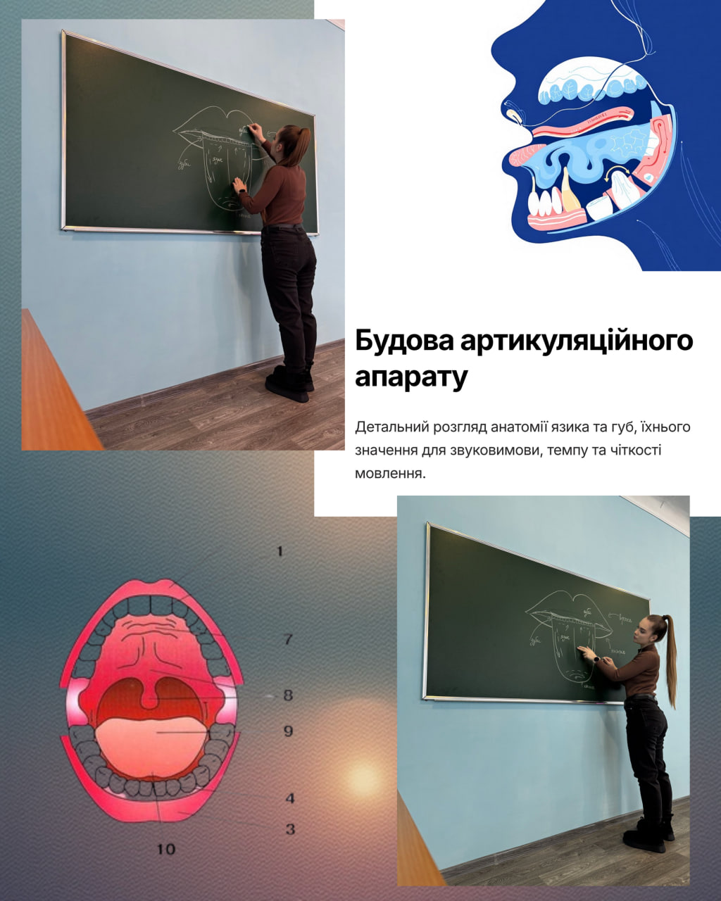 📌Окрему увагу було приділено анатомічній будові артикуляційного апарату: язика та губ, їх функціям та ролі у формуванні правильної звуковимови й мовленнєвої координації.