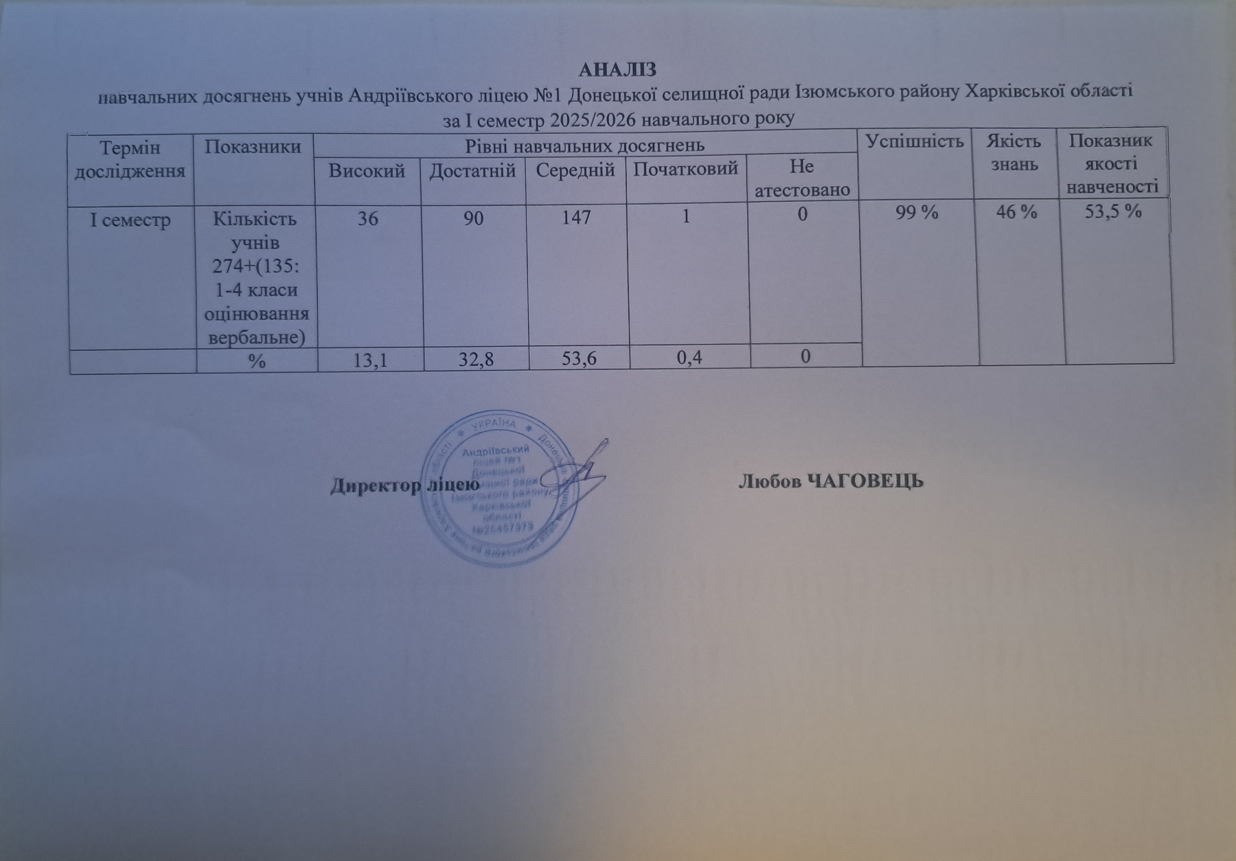 про діяльність Андріївського ліцею №1 відповідно до