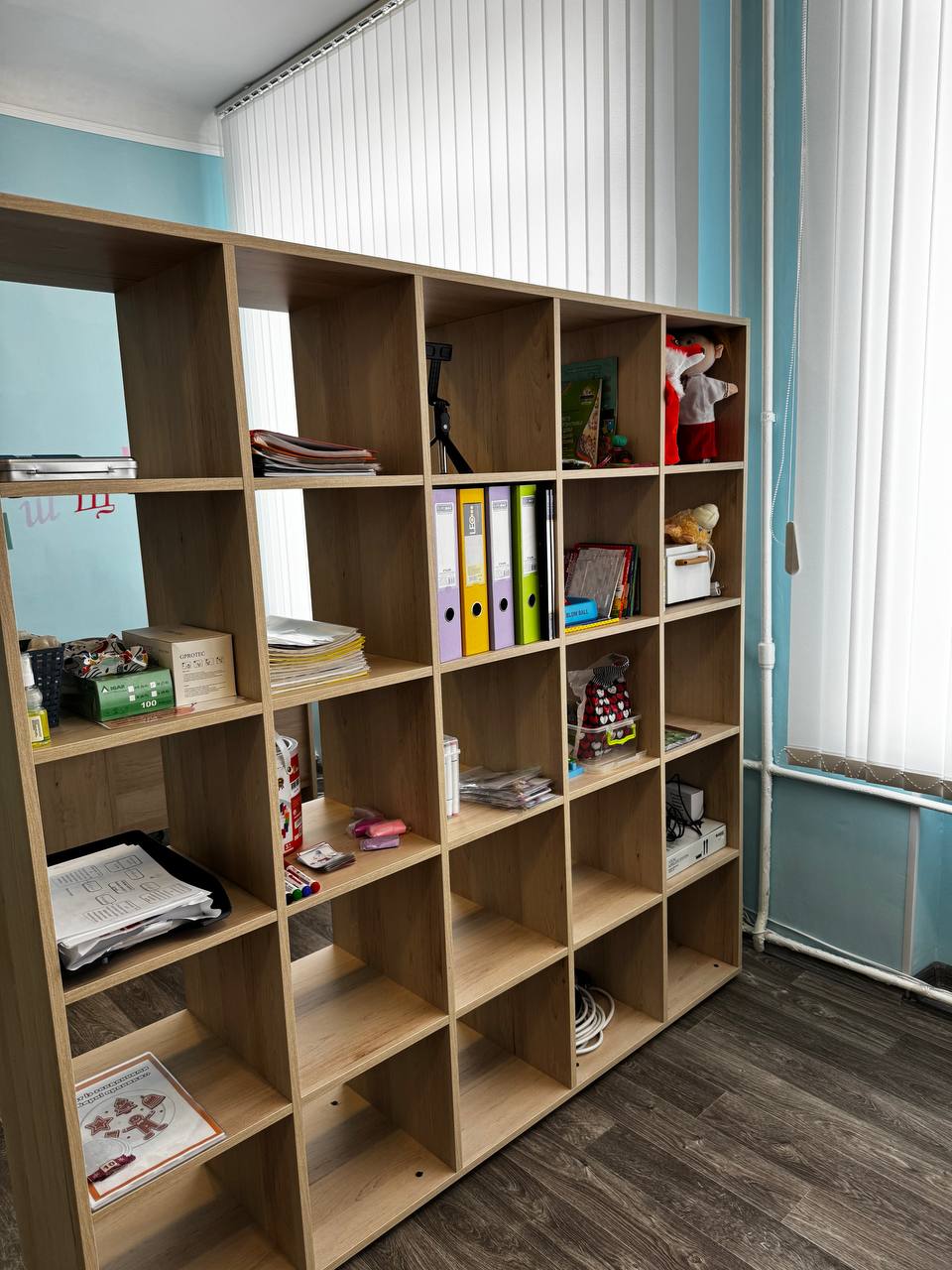 Шафи та полиці містять структуровану систему навчальних ресурсів: артикуляційні картки, дидактичні матеріали, нейроігри та авторські комплекси вправ. Кожен елемент має своє місце, що забезпечує ефективність і швидкість підготовки до занять.