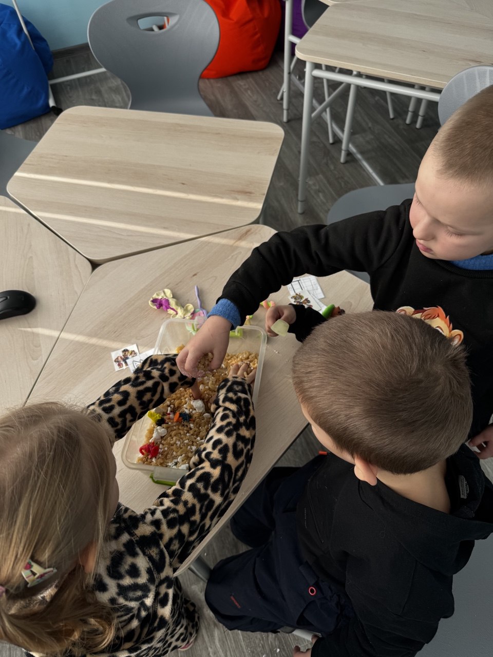 Світла, стильна та продумана зона занять створена для живої взаємодії, розвитку і натхнення. Тут кожна деталь працює на результат: ергономічні меблі підтримують правильну посадку, кольорові акценти стимулюють увагу, а логічне зонування допомагає дітям легко переключатися між різними видами діяльності.